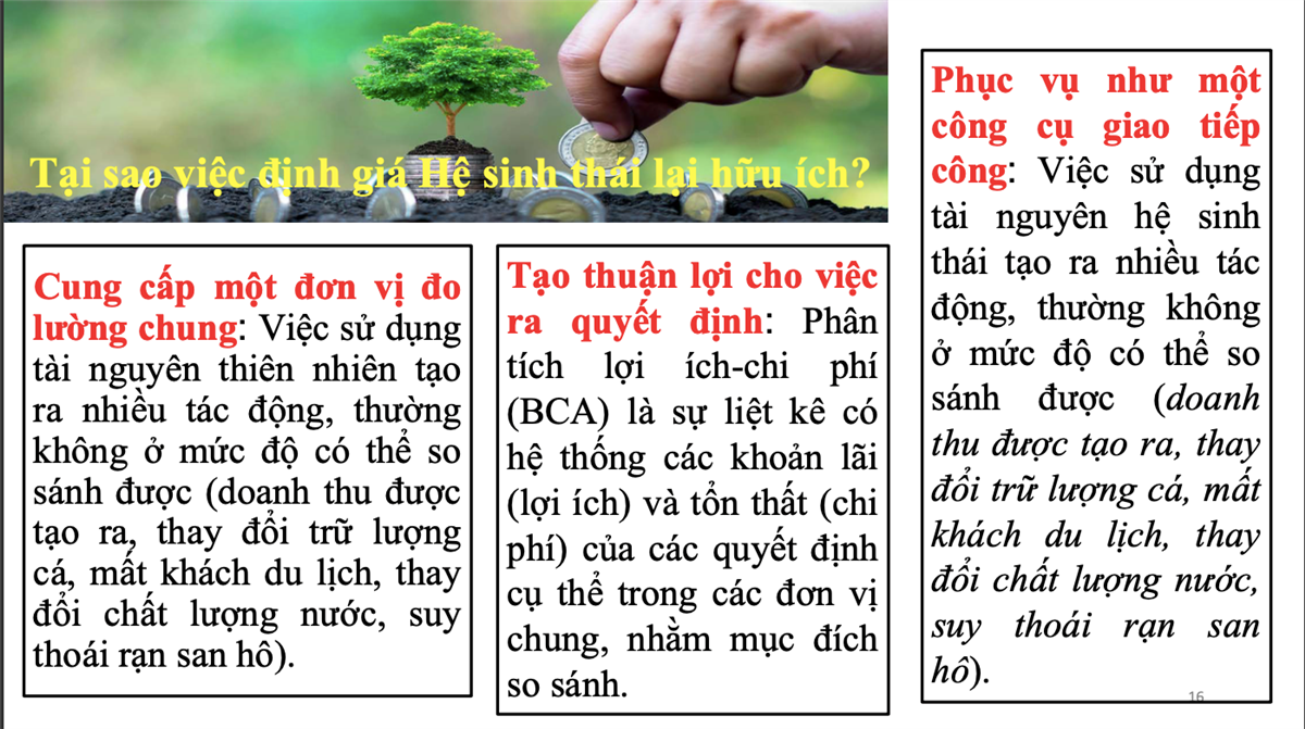 Trước tác động của biến đổi khí hậu, việc giới thiệu phương pháp định giá hệ sinh thái nhằm mục tiêu bổ trợ kiến thức để các bạn đưa ra các giải pháp phù hợp cho phát triển kinh tế đi kèm với bảo vệ môi trường tự nhiên.