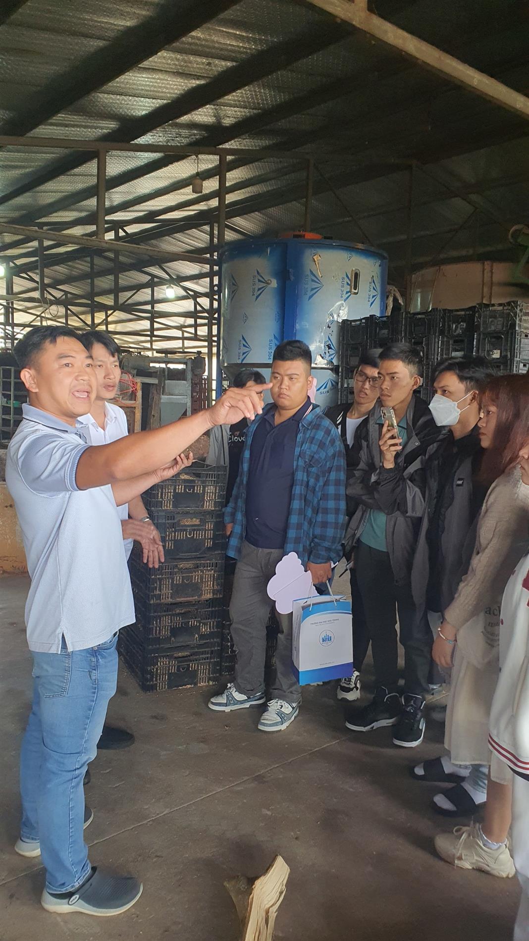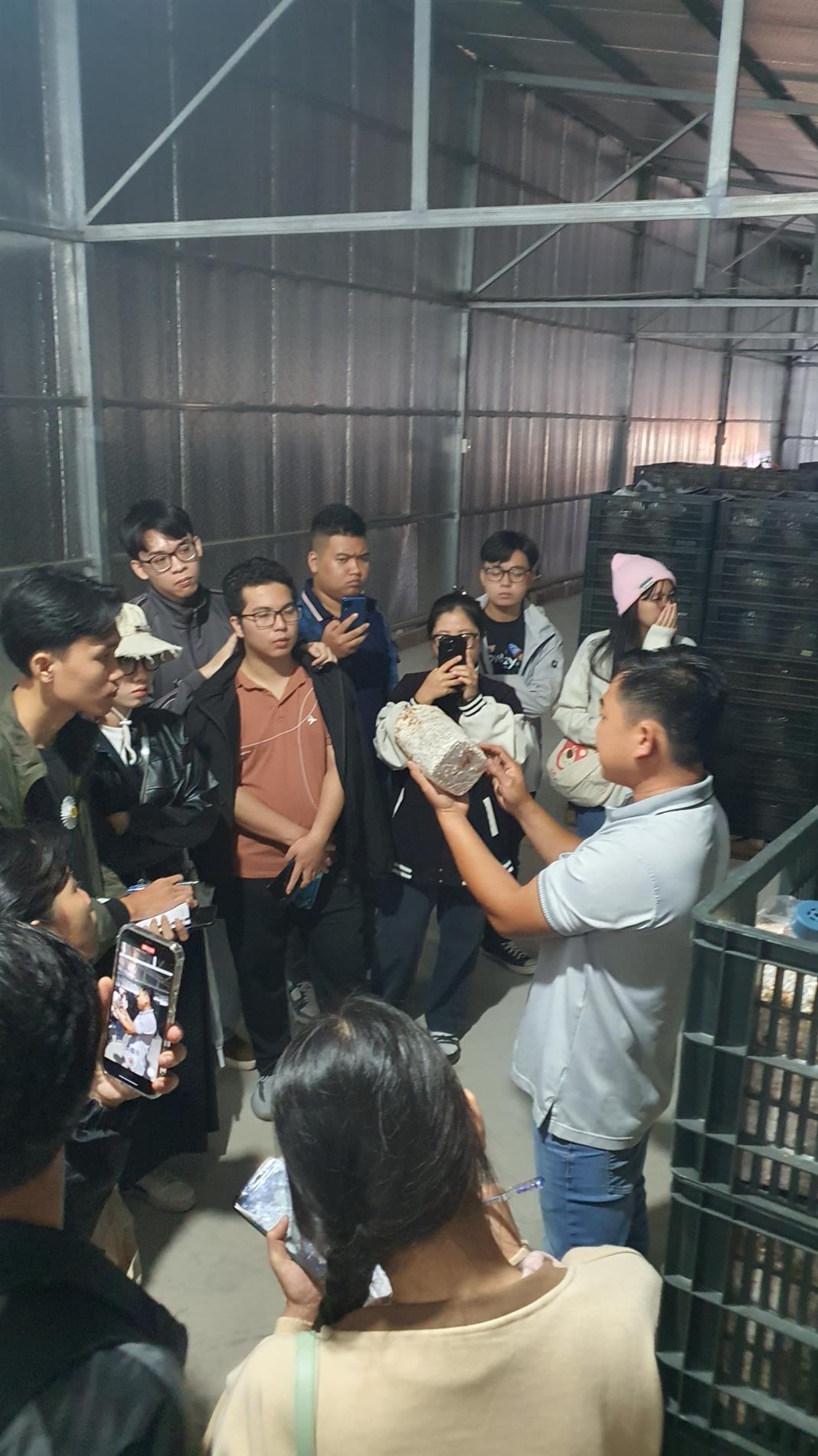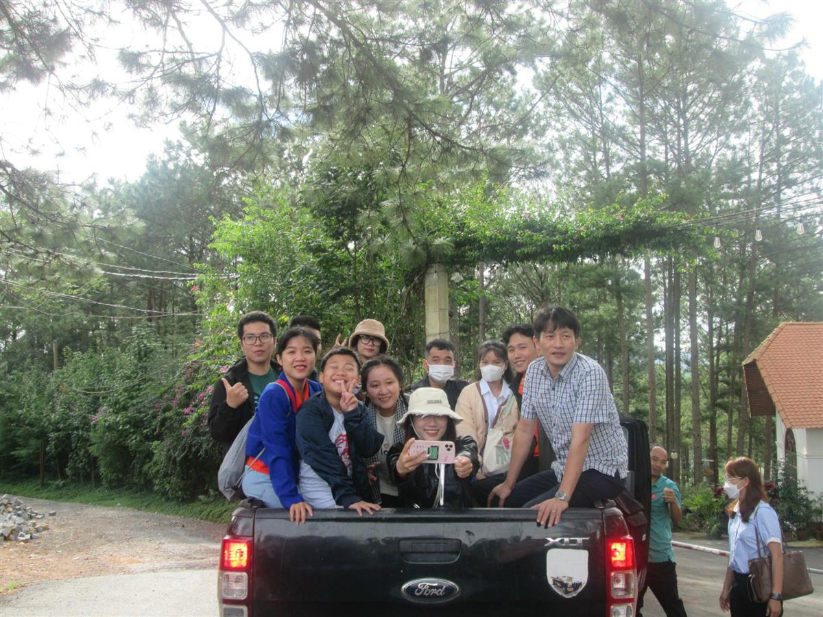Chia tay thành phố Đà Lạt, đoàn kiến tập di chuyển về Lạc Dương để đến tham quan Công ty cổ phần Nguyên Long – là công ty chuyên về trồng nấm, đặc biệt là nấm hương được xem là sản phẩm “độc quyền” của công ty. Công ty được thành lập từ niềm đam mê nghiên cứu về nấm của TS. Trương Bình Nguyên – Giảng viên Trường ĐH Đà Lạt, Thầy đã có công phát hiện, nghiên cứu, lai tạo nấm hương từ tự nhiên trở thành đặc sản cao cấp. Tại đây, SV được anh Khương – là người quản lý công ty dẫn đi giới thiệu về cơ sở vật chất và quy trình sản xuất nấm hương. Bằng kinh nghiệm thực tế của mình, anh Khương đã chia sẻ, giải thích tường tận về quy trình, những kỹ thuật, lưu ý, vấn đề gặp phải trong quá trình trồng nấm. SV đặc biệt cảm thấy rất hứng thú với những chia sẻ và giải đáp thắc mắc của anh.