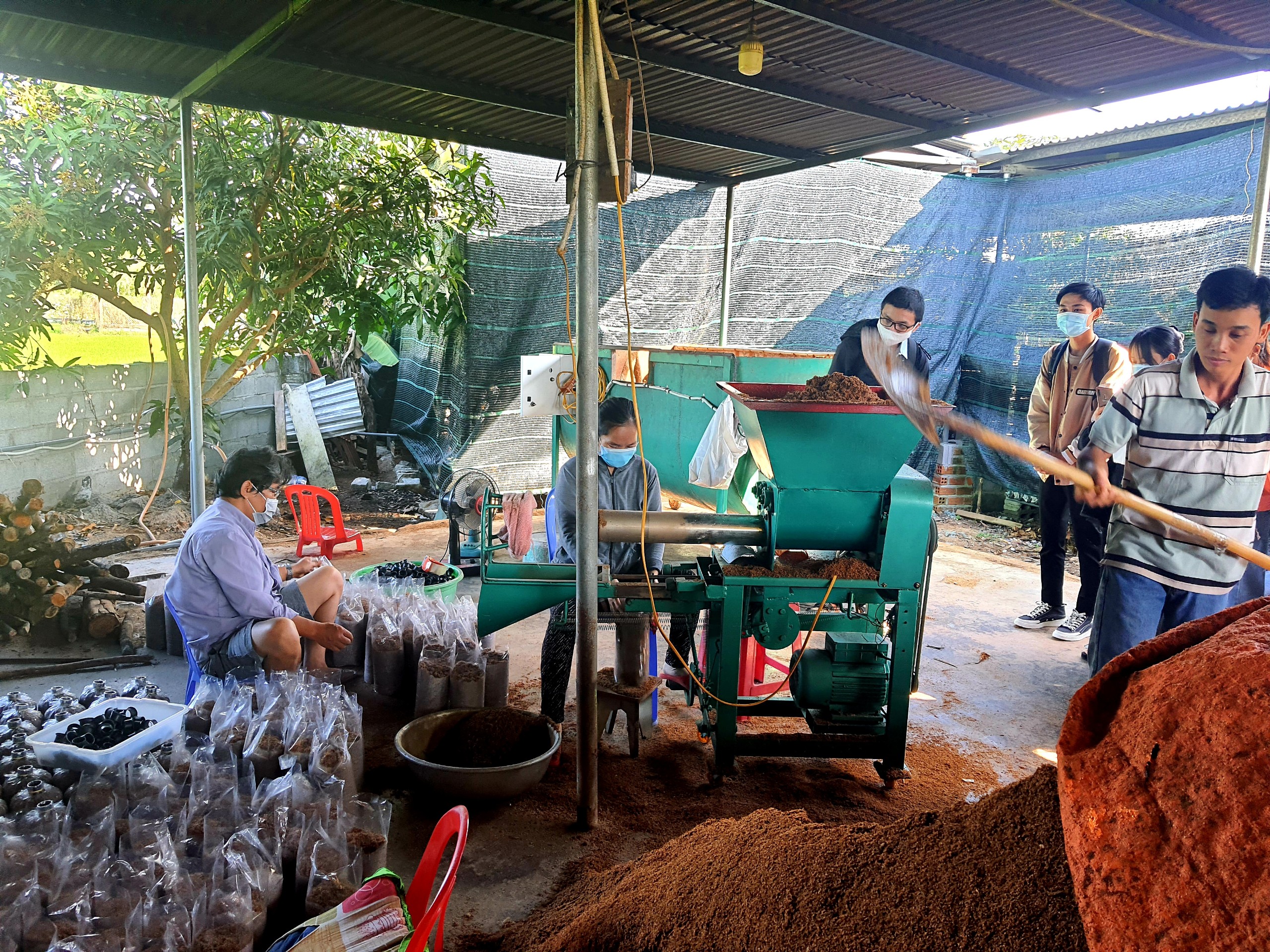 Nguyên liệu mùn cưa đang được trộn đảo để đóng bịch tại cơ sở sản xuất