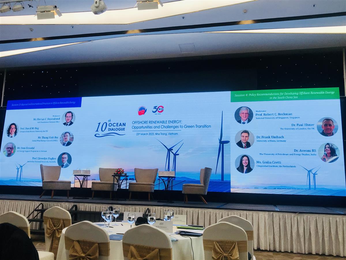 Trong phiên đối thoại chủ đề “Khuyến nghị chính sách về phát triển năng lượng tái tạo ngoài khơi ở Biển Đông” với sự tham gia hai khách mời trẻ đang nghiên cứu về các giải pháp để phát triển năng lượng tái tạo ngoài khơi ở Biển Đông. Dr. Aswani cho rằng việc phát triển năng lượng tái tạo ngoài khơi có thể là một phương án đáng được xem xét để giải quyết mâu thuẫn địa chính trị ở Biển Đông, việc hợp tác các bên sẽ cùng hướng đến mục tiêu phát triển bền vững. Bên cạnh đó, Ms. Cretti đã đưa ra giải pháp cần đầu tư xây dựng cơ sở hạ tầng để tạo lưới điện chung ở khu vực Biển Đông (called Asean power grid), điều này có thể giúp các nước cùng trao đổi, thảo luận những vấn đề liên quan đến kỹ thuật, chính sách, tài chính và chính trị dễ dàng hơn.