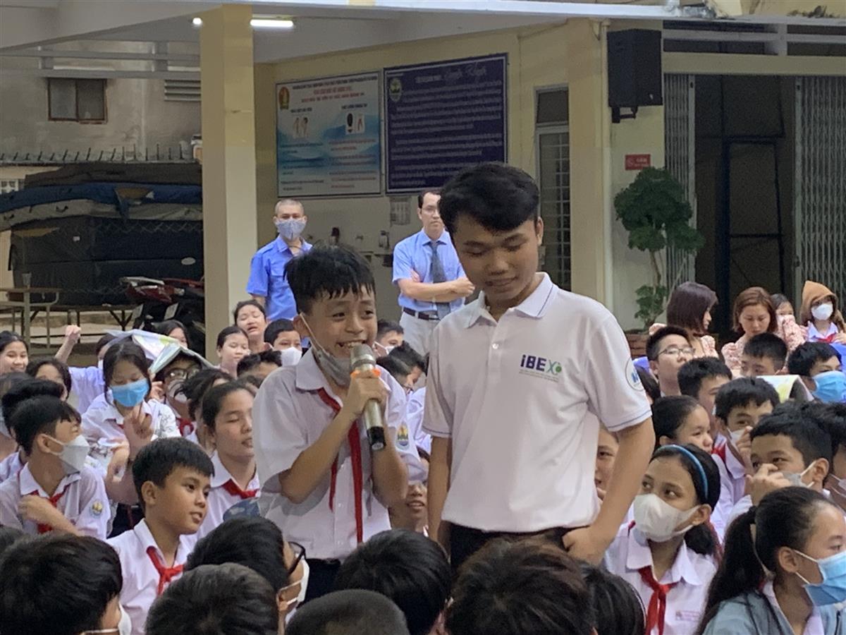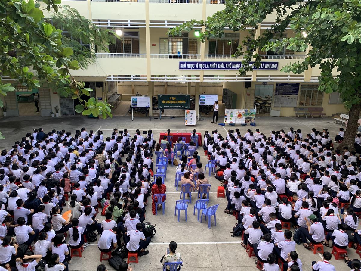 Hơn 500 học sinh THCS Nguyễn Khuyến đã tham gia sôi nổi hào hứng với các câu hỏi tương tác, các phần minigame tổng kết các kiến thức và hành động hiệu quả giảm nhẹ khí nhà kính, bảo vệ môi trường biển.