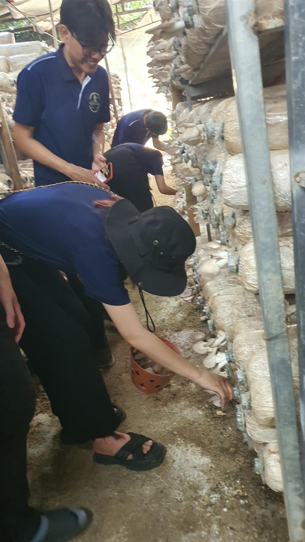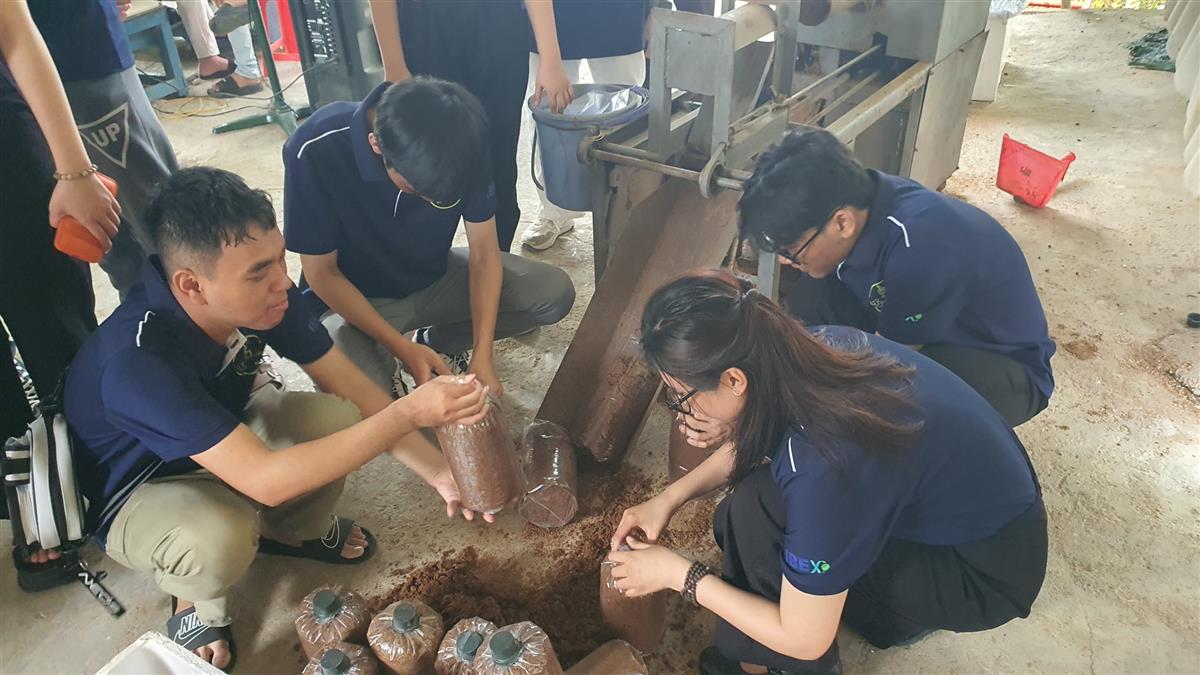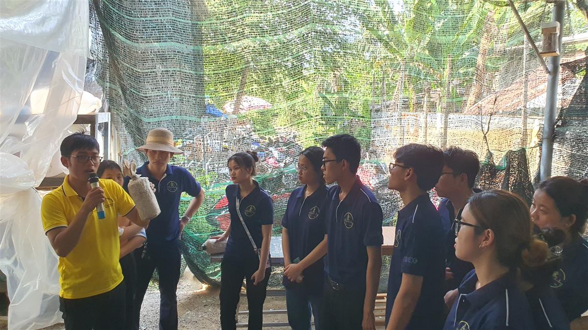 Anh Nguyễn Hữu Ngọc, C-Founder HTX Nấm Nha Trang cũng là cựu sinh viên khoa Công nghệ Thực phẩm, Trường ĐH Nha Trang đã tiếp đón rất nhiệt tình các em sinh viên đến tham quan HTX. Bắt đầu chương trình, anh Ngọc tổ chức các game khởi động rất vui nhộn và sôi nổi với những phần quà hấp dẫn. Tiếp đến, anh Ngọc giới thiệu sinh viên toàn bộ quy trình trồng nấm tại HTX từ khâu phối trộn nguyên liệu, đóng bịch, hấp tiệt trùng, cấy giống, ươm giống, treo lên giàn, đến khâu chăm sóc, thu hái nấm. Anh giải thích rất cặn kẽ những điều cần lưu ý ở mỗi công đoạn và trả lời các câu hỏi thắc mắc của sinh viên. Sinh viên còn được trực tiếp làm một số công đoạn như đóng bịch và hái nấm.