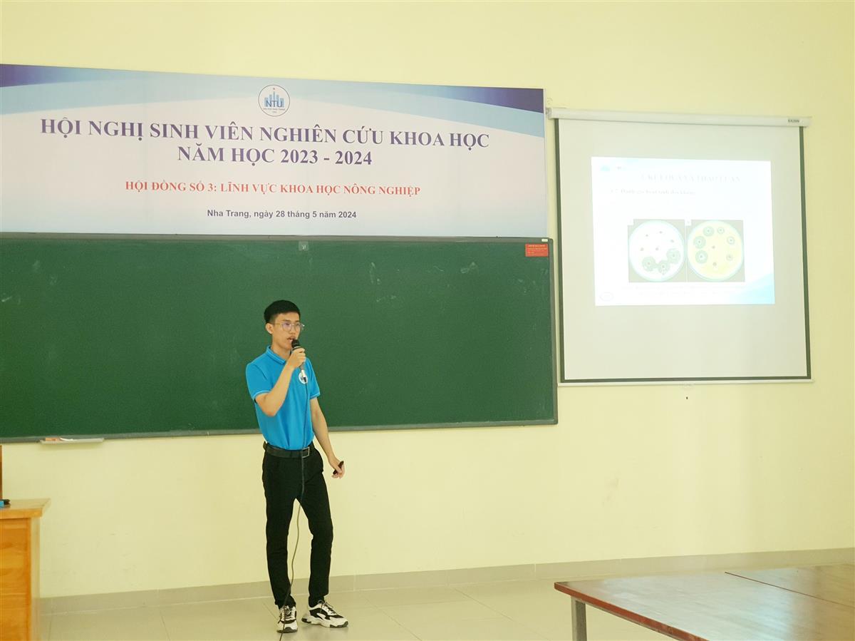 Ngày 28/5/2024, Trường Đại học Nha Trang tổ chức Hội nghị Sinh viên nghiên cứu khoa học năm 2023-2024. Trong 19 đề tài của sinh viên toàn trường thì Viện CNSH & MT có 4 đề tài sinh viên tham gia hội nghị thuộc lĩnh vực khoa học nông nghiệp. Đây là cơ hội để sinh viên tiếp cận một số hình thức hoạt động khoa học, có điều kiện phát huy năng lực nghiên cứu, góp phần nâng cao chất lượng học tập. Qua đó tạo động lực, khích lệ tinh thần tham gia tích cực hơn nữa các hoạt động nghiên cứu khoa học trong sinh viên.