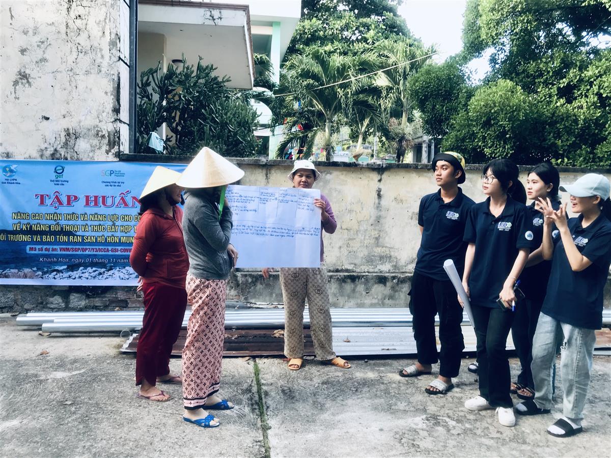 Sinh viên Bộ môn Kỹ thuật môi trường, Viện Công nghệ sinh học & Môi trường đã tham gia lớp tập huấn “Nâng cao nhận thức và năng lực cho cộng đồng về kỹ năng đối thoại và thúc đẩy hợp tác bảo vệ môi trường và bảo tồn rạn san hô Hòn Mun, vịnh Nha Trang” diễn ra từ ngày 01-02/11/2023 tại Đảo Bích Đầm, phường Vĩnh Nguyên, Nha Trang trong khuôn khổ Dự án “Thúc đẩy đối thoại, hợp tác giữa cộng đồng và khối tư nhân với cơ quan nhà nước trong bảo tồn rạn san hô và phát triển bền vững khu vực biển Hòn Mun, vịnh Nha Trang, tỉnh Khánh Hòa” do Hội Liên Hiệp Phụ nữ tỉnh Khánh Hoà chủ trì được tài trợ bởi Quỹ Môi trường toàn cầu, Chương trình tài trợ các dự án nhỏ tại Việt Nam.