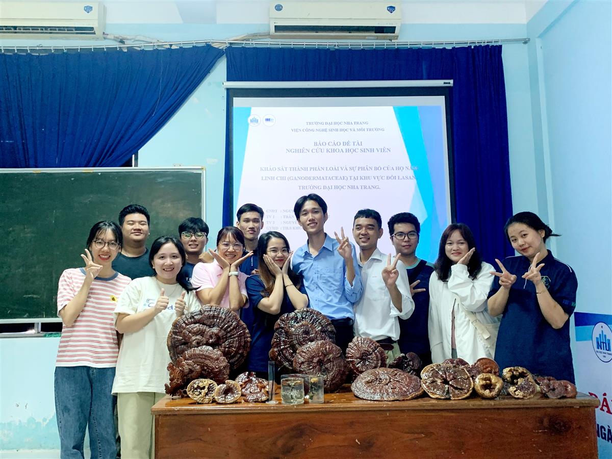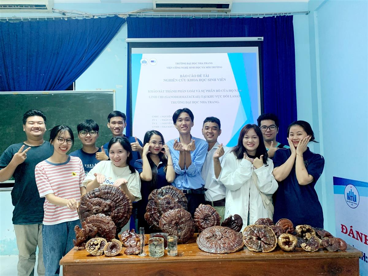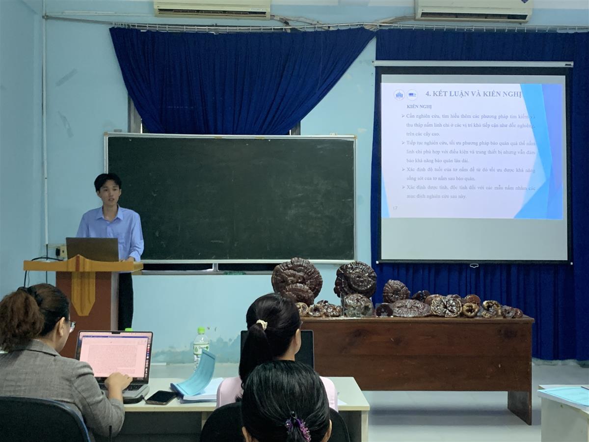 Tại buổi nghiệm thu, SV Nguyễn Tuấn Vũ thay mặt nhóm nghiên cứu báo cáo các nội dung chính của đề tài. Đề tài đã Đã xác định được khoảng 59 cá thể nấm linh chi (Ganodermataceae) trong khuôn viên Trường ĐH Nha Trang và thu thập, bảo quản 30 cá thể trong tình trạng khá tốt trong các túi hút chân không. Định danh các mẫu nấm thu được bằng hình thái và sinh học phân tử; và kết luận các điều kiện bảo quản tơ nấm linh chi tốt nhất.