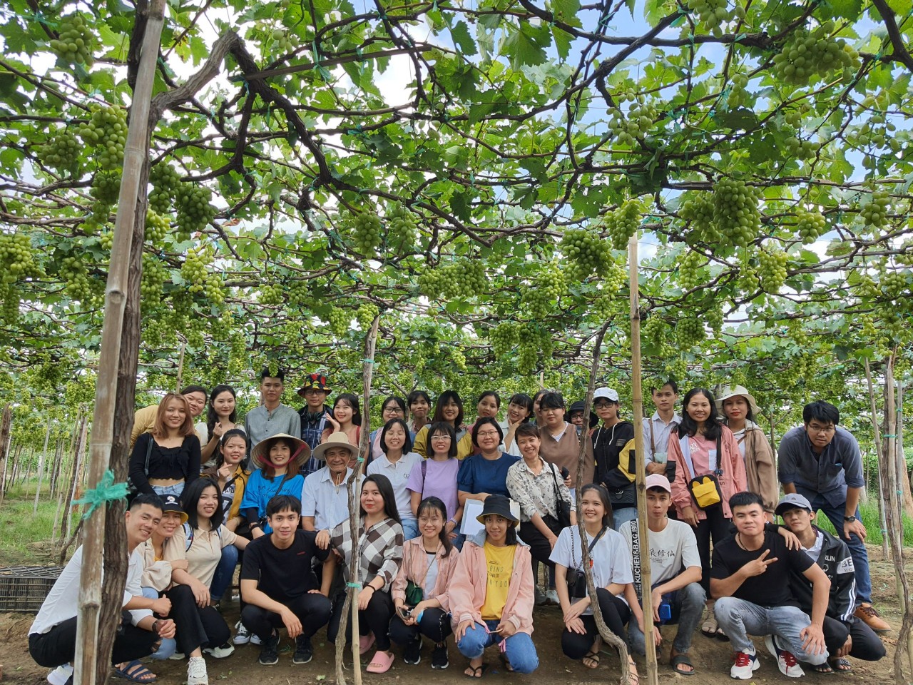 Cô và trò tại vườn nho trĩu quả xanh mọng của trang trại Ba Mọi, Ninh Thuận.