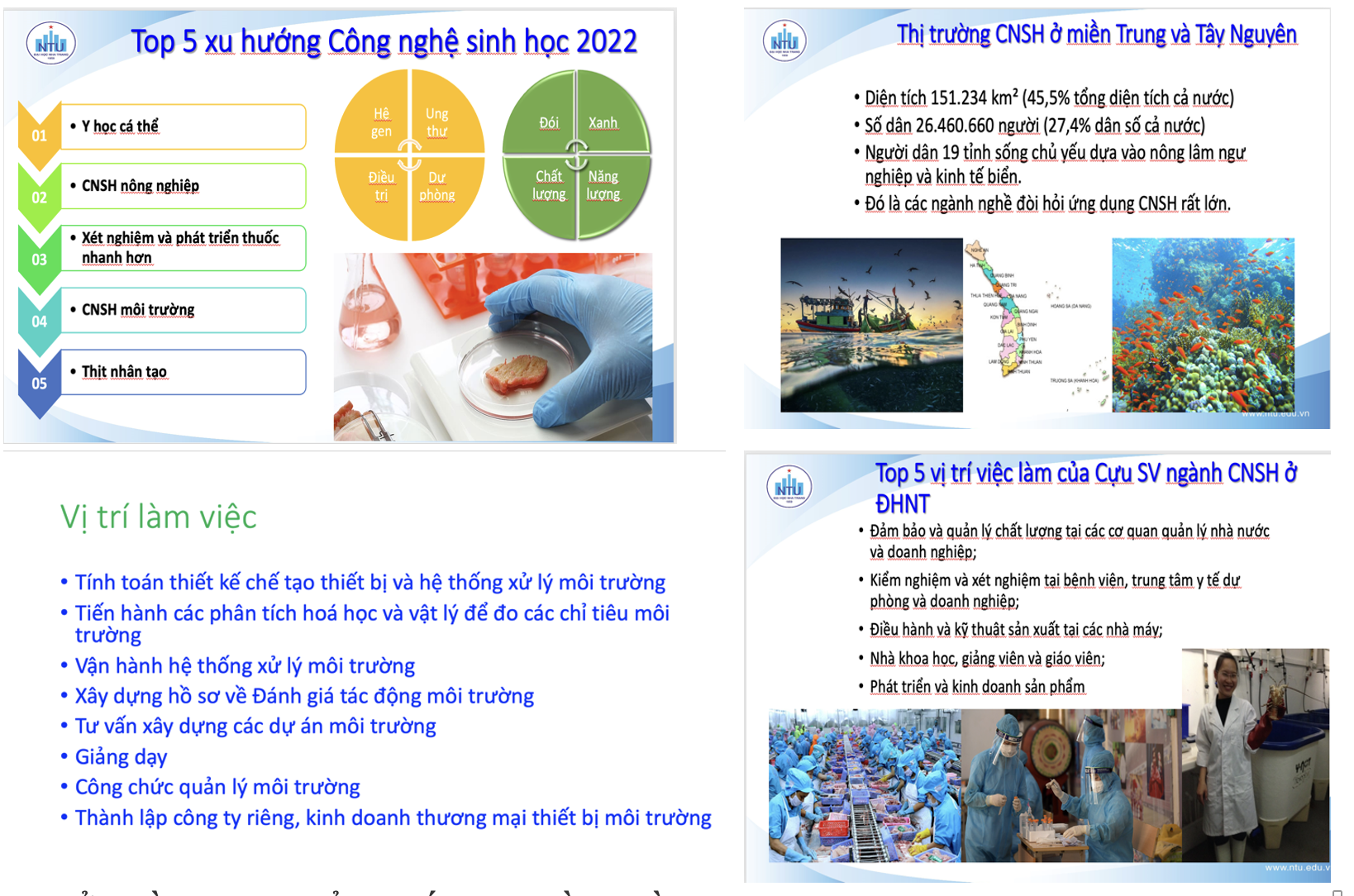 Tại phần thứ nhất nội dung chia sẻ của PGS.TS Ngô Đăng Nghĩa và PGS.TS Nguyễn Văn Duy về xu hướng công nghệ và thị trường lao động ngành Kỹ thuật môi trường và Công nghệ sinh học. Bên cạnh đó, các giảng viên cũng chia sẻ về những cơ hội và thách thức đối với thị trường lao động cho 2 ngành KTMT và CNSH. Để trở thành chuyên gia, nhà quản lý và sản xuất, kinh doanh CNSH và KTMT bên cạnh sự đam mê, kiên nhẫn và có khát vọng; sinh viên cần trau dồi các kỹ năng mềm.