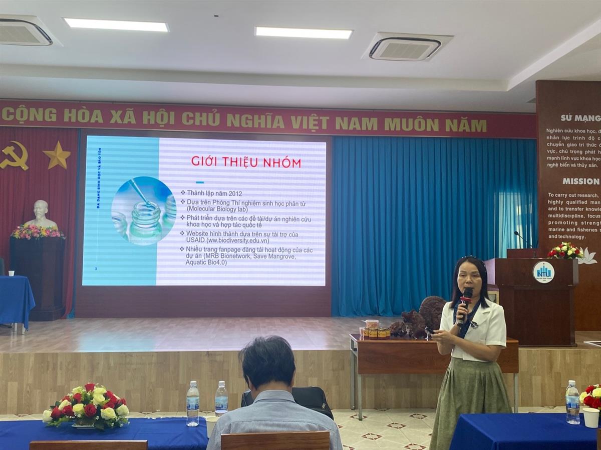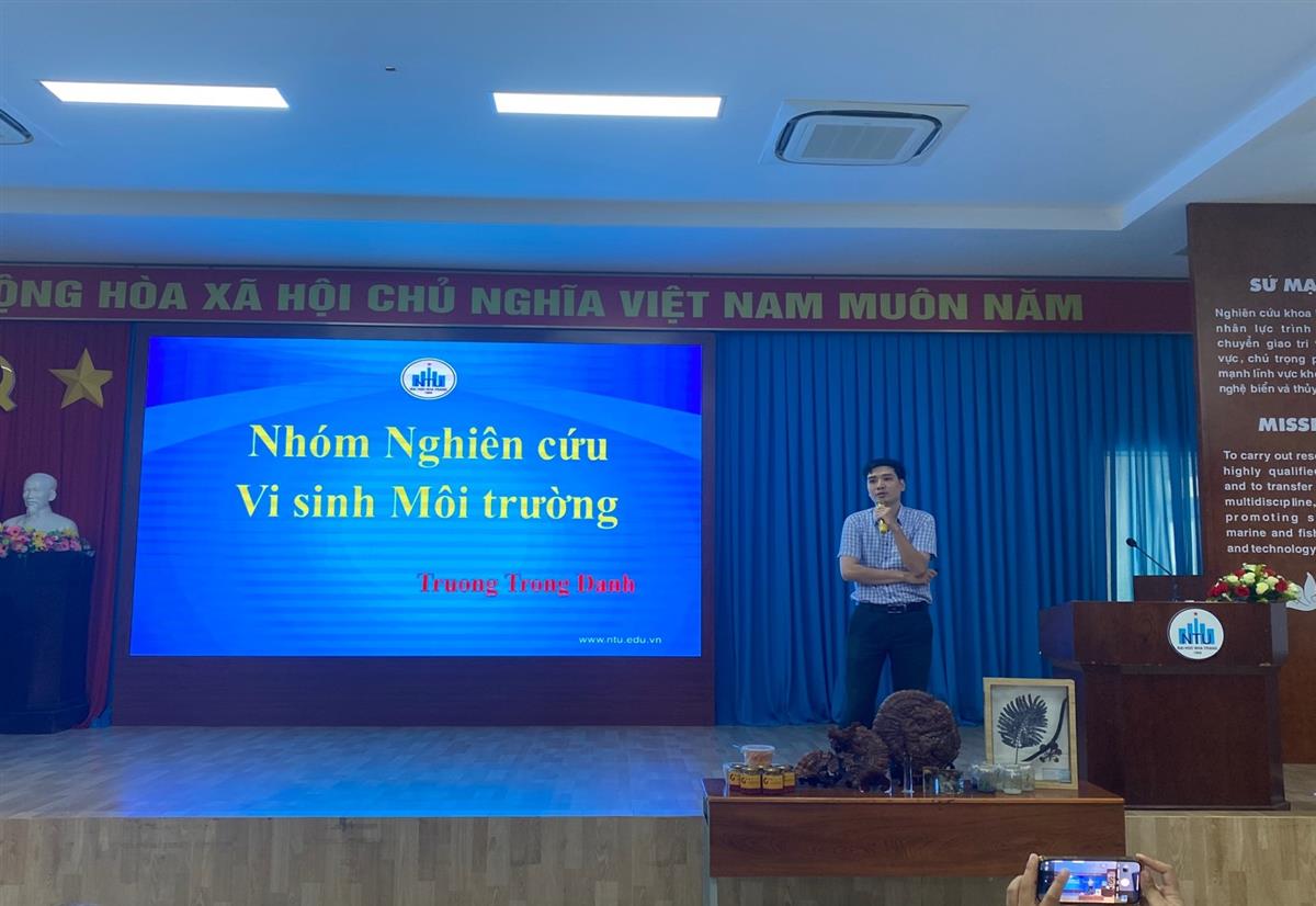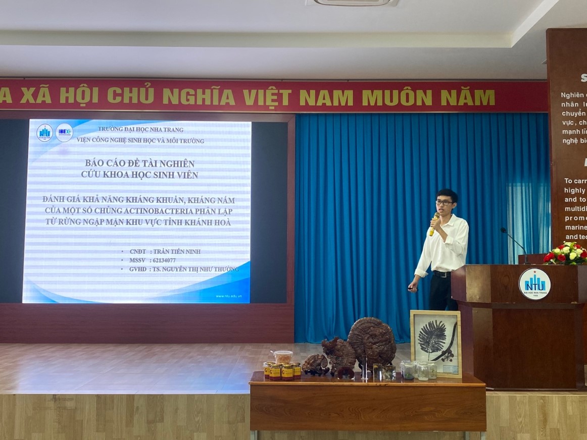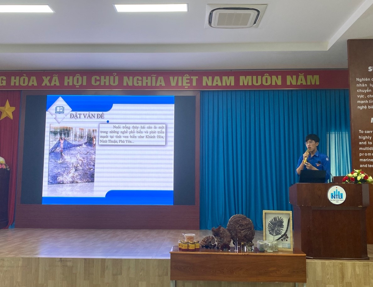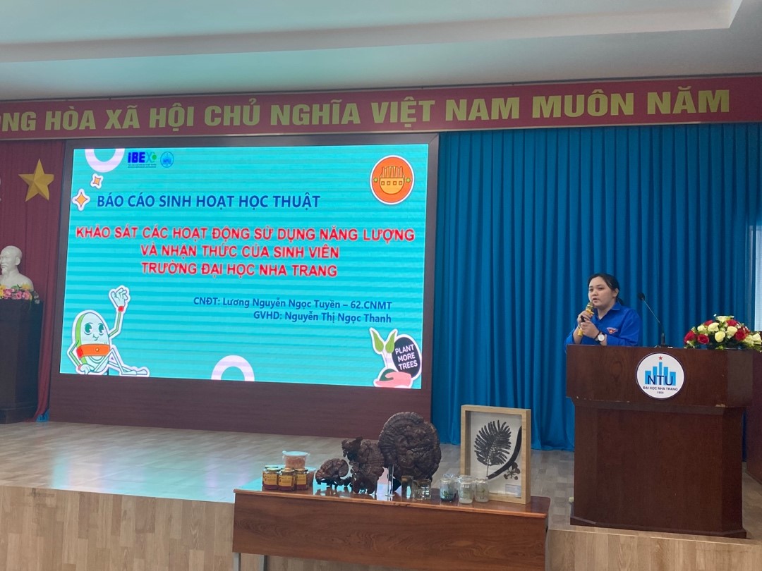 Hội nghị lần này thông qua 03 báo cáo nghiên cứu khoa học của sinh viên Các báo cáo bao gồm: 1. Đánh giá khả năng kháng khuẩn, kháng nấm của một số chủng Actinobacteria phân lập từ rừng ngập mặn khu vực tỉnh Khánh Hoà (sinh viên Nguyễn Tiến Ninh 62CNSH trình bày), 2. Nghiên cứu khả năng hấp thụ một số hợp chất nitrogen trong nước thải ao nuôi tôm của vi tảo Spirulina sp. do sinh viên Phạm Gia Luân 63CNMT trình bày và báo cáo về kết quả đánh giá nhận thức và các hoạt động sử dụng năng lượng của sinh viên Trường Đại học Nha Trang do sinh viên Lương Nguyễn Ngọc Tuyền 62CNMT thực hiện. Các báo cáo đã được trao đổi, chia sẻ và thảo luận sôi nổi từ các Thầy, Cô, và các bạn sinh viên.